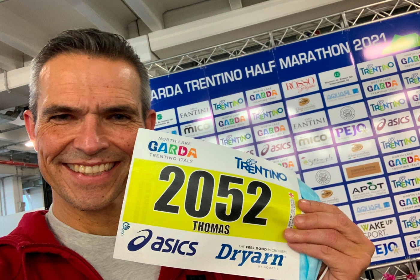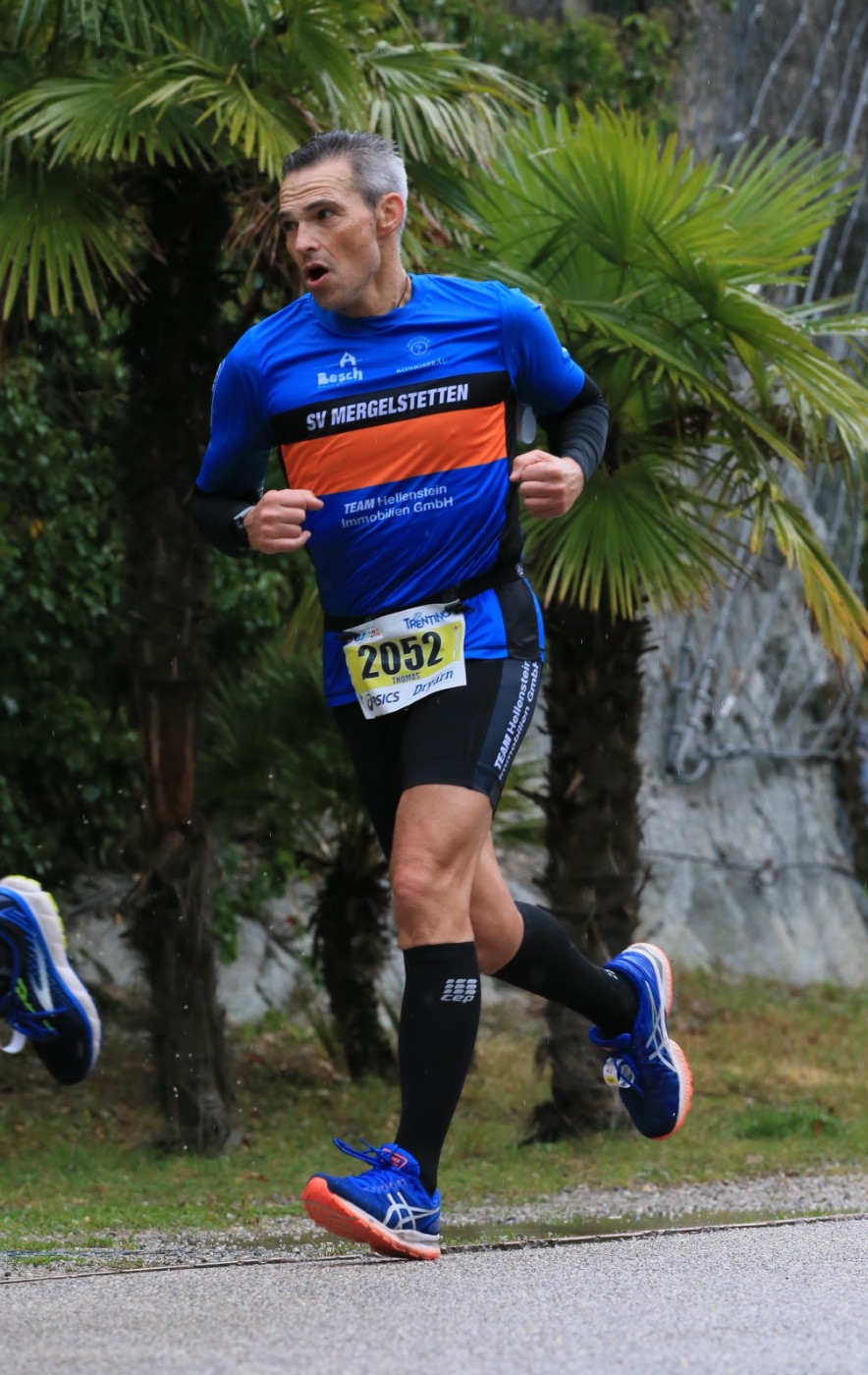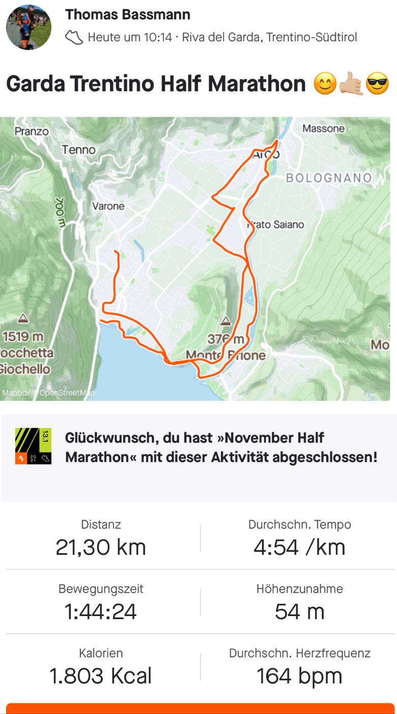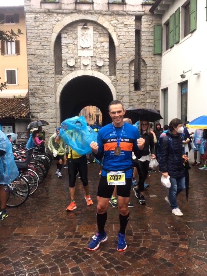 Trotz Pandemie-Bedingungen zogen die Veranstalter aber auch dieses Mal den Rennvortag, aber dann noch viel mehr den Renntag selbst, sehr professionell und sicher für alle Beteiligten durch. Die ersten 500 Meter mussten zwar mit Maske gelaufen werden, aber das steckten die Teilnehmer*innen genau so locker weg, wie den genau zum Start um 10.15 Uhr einsetzenden Regen. Die Halbmarathon-Strecke schlängelt sich durch Riva, durch den Tunnel Richtung Torbole und dann am Monte Brione entlang zum wunderschönen Städtchen Arco, wo übrigens die ebenfalls angebotene 10km-Strecke startet. Danach geht es am Fluss Sarca entlang zurück zum Gardasee und dann auf dem Uferweg zurück nach Riva. Dort läuft man direkt am Torre Apponale vorbei Richtung Zielbogen auf der Piazza III. Novembre. Eine wunderschöne Strecke, die einen insgesamt mehr in Urlaubsgedanken schwärmen als über die Strapazen des Laufs nachdenken lässt! Dementsprechend ging es auch mir noch richtig gut, nachdem ich nach 1:44:44 im Ziel war.